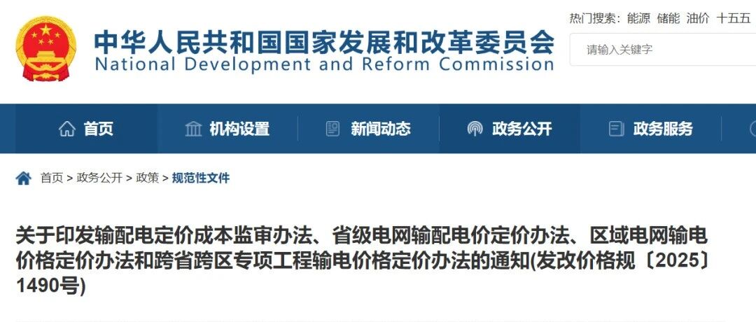 区域电网输电价格定价办法和跨省跨区 专项工程输电价格定价办法的通知 发改价格规〔2025〕1490号 国家发展改革委关于印发输配电定价成本 监审办法、省级电网输配电价定价办法、 11月27日,国家发改委印发《输配电定价成本监审办法、省级电网输配电价定价办法、区域 电网输电价格定价办法和跨省跨区专项工程输电价格定价办法的通知》。 原文如下: 各省、自治区、直辖市发展改革委,国家电网有限公司、南方电网有限责任公司、内蒙古电力 (集团)有限责任公司: 为贯彻落实中共中央办公厅、国务院办公厅《关于完善价格治理机制的意见》要求,进一步完善 电网企业输配电环节价格监管制度,经商国家能源局,我们研究制定了《输配电定价成本监审办 法》《省级电网输配电价定价办法》《区域电网输电价格定价办法》和《跨省跨区专项工程输电 价格定价办法》。现印发给你们,请按照执行。 国家发展改革委 2025年11月21日 附件: 《输配电定价成本监审办法》.pdf 《省级电网输配电价定价办法》.pdf 《区域电网输电价格定价办法》.pdf 《跨省跨区专项工程输电价格定价办法》.pdf 第五条 输配电定价成本监审应当以经政府有关部门或会计师 事务所审计 ...