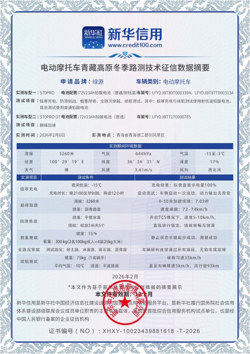 绿源电动摩托车完成青藏高原冬季极限环境测试 关键数据获新华信用技术征信记录