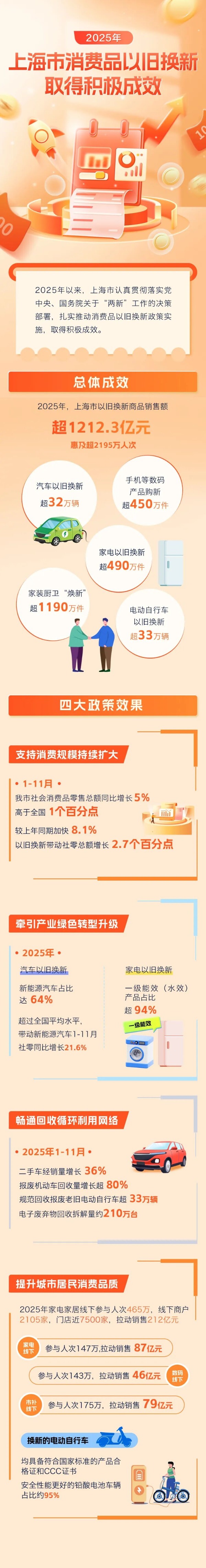 1月7日,2026年上海首批家电数码国补券如期到账,线下店迎来第一轮中签顾客。智通财经 (www.thepaper.cn)记者从上海市商务委获悉,2025年,上海市以旧换新商品销售额超1212.3亿元,惠 及超2195万人次。 上海市商务委透露,2025年1-11月,上海市社会消费品零售总额同比增长5%,高于全国1个百分点。较 上年同期加快8.1%,以旧换新带动社零总额增长2.7个百分点。 2025年,上海市以旧换新商品销售额超1212.3亿元,惠及超2195万人次。其中,汽车以旧换新超32万 辆,手机等数码产品购新超450万件,家电以旧换新超490万件,家装厨卫"焕新"超1190万件,电动自行 车以旧换新超33万辆。 2025年家电家居以旧换新线下参与人次465万,线下商户2105家,门店近7500家,拉动销售212亿元。家 电以旧换新线下参与人次147万,拉动销售87亿元。数码以旧换新线下参与人次143万,拉动销售46亿 元。"市补"线下参与人次175万,拉动销售79亿元。 智通财经高级记者 邹娟 2026年1月 7日,苏宁易购首张补贴订单在浦东第一店产生。受访者 供图 当天,苏宁易购首张补贴订单在浦东第 ...