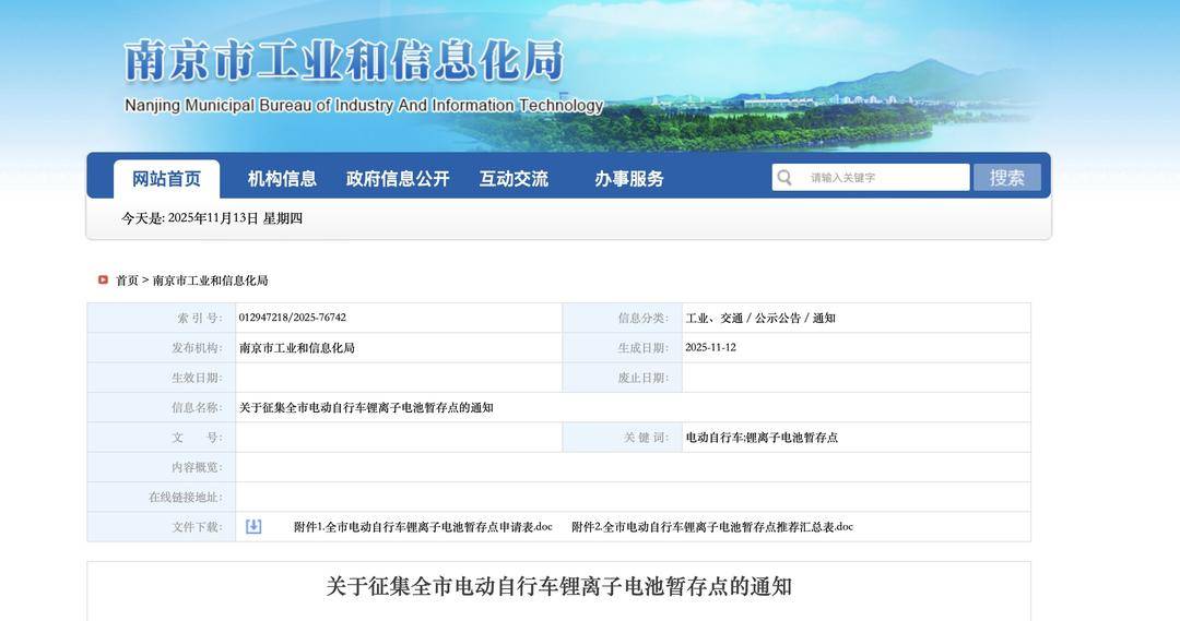 Core Points - Nanjing is actively seeking to establish temporary storage points for electric bicycle lithium-ion batteries to enhance safety and standardize the recycling system [2][3] - The initiative is part of a broader effort to improve the recycling and utilization management of lithium-ion batteries in the city, following national guidelines [2][4] Group 1: Temporary Storage Requirements - Temporary storage points must be legally registered, have independent legal status, and have no major safety, environmental, or quality incidents in the past three years [3] - Storage must utilize iron cabinets or explosion-proof cabinets, with a maximum of 10 batteries per cabinet and a total of 20 batteries at the storage point [3] - Cabinets should be placed outdoors with appropriate warning signs and must not be near building entrances, windows, or flammable materials [3] Group 2: Safety and Emergency Protocols - Temporary storage points are encouraged to discharge batteries safely before storage and must establish emergency safety training for staff [3] - A complete and clear record of battery recycling must be maintained and reported to the relevant industrial and information authorities [3] Group 3: Broader Context and Industry Impact - Nanjing's initiative is part of a city-wide safety management plan for electric bicycles, focusing on sales, usage, and recycling [4] - Other regions in Jiangsu are also developing battery recycling systems, with initial companies already identified for local collection [4] - The national guidelines aim to mitigate safety risks associated with improper disposal and enhance the recycling of critical materials like lithium, cobalt, and nickel [4]