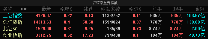 凤凰网财经讯 1月22日,三大指数集体高开,沪指高开0.22%,深成指高开0.41%,创业板指高开 0.52%,以存储为首的半导体芯片股领涨市场。 | | | | | | 沪深京重要指数 | | | | | --- | --- | --- | --- | --- | --- | --- | --- | --- | | 名称 | *● | 最新 | 张幅% | | 涨跌 涨跌家数 | 张速% | 息手 | 现手 金额 | | 上证指数 | | 4126.07 | 0.22 | 9.13 | 1133/752 | 0.11 | 535万 | 535万 103.57亿 | | 深证成指 | | 14313.63 | 0.41 | 58.50 | 1594/824 | 0.07 | 778 F | 778万 138.08亿 | | 北证50 | | 1529.00 | 0.61 | 9.25 | 165/89 | 0.73 | 8.74万 | 8.74万 2.00亿 | | 创业板指 | | 3312.75 | 0.52 | 17.23 | 794/438 | 0.11 | 1847 | 184万 49.73亿 | ...