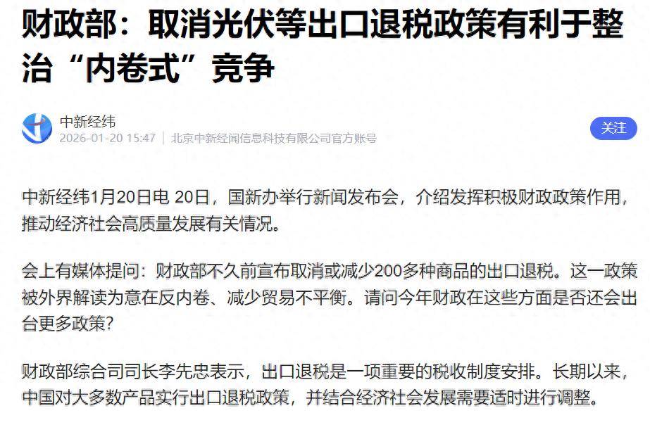 过去20年,我们用全球最全的产业链和最拼命的工厂模式,把"Made in China"刻进了世界人的日常。 但现在,高层突然踩下了刹车。取消出口退税、设定电动车出口底价、罕见地在出口大省广东高调喊话要"扩大进口",这场外贸脱胎换骨的动作,不止 是"反内卷",更是全体系的大洗牌。 就是打一场"去低价化"的攻坚战。中国外贸或许要反内卷了! 现在财政断奶,第一个动的是光伏。 为什么这一仗必须打?答案直指两个字:失衡。 中国最大宗的退税去向,就是光伏和电子产品这些内卷最严重的行业。 财政在补贴、企业在拼价、利润却被海外客户拿了去。这哪是一笔划算的买卖?这是在用国家口袋补贴全球消费。 从2026年4月1日起,一刀切取消光伏产品的出口退税,电子产品的退税率从9%降到6%。 这波政策不只是冲着终端来的,更多是针对中间品,包括电池片、硅片、玻璃等,背后逻辑非常明确:打掉最低价格体系,让全球客户为真实的生产成本买 单。 这个操作的深意何在?有三种算盘: 其一,财政不再替企业买单。支持可以有,但不能内卷到财政都白给还不能涨价的地步。 其二,倒逼企业涨价。让全球市场看到一旦脱离中国供应链,涨的是全球成本,不仅仅是中国制造贵了,是世 ...