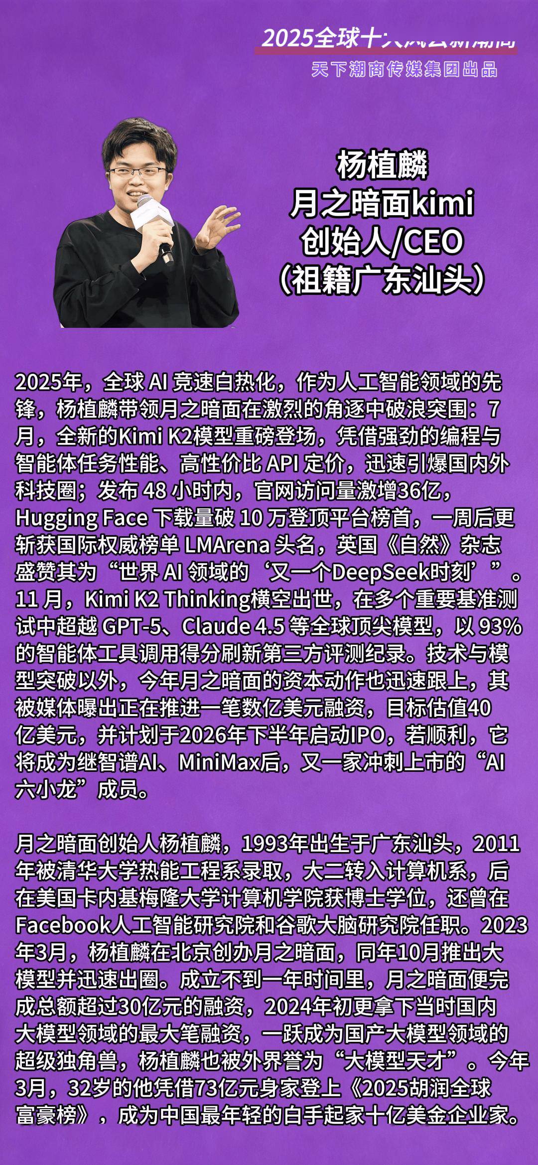 在这个瞬息万变且充满无限可能的时代,新生代潮商群体勇立潮头,既深植于父辈传承的深厚商业根基,又以无畏的开拓精神与前瞻性的创新理念,锐意 进取,不断突破传统边界,成为推动商业世界变革的新兴力量。今日,天下潮商传媒隆重发布"2025全球十大风云新潮商"榜单,入选的杰出新生代潮商于 各自深耕的领域内铸就了令人瞩目的辉煌成就。他们既承续了潮商文化的精髓,又勇于探索未知,以卓越的智慧与不懈的奋斗,在商业舞台上绽放出耀眼 光芒。他们的崛起,不仅是个人荣耀的彰显,更是潮商群体蓬勃生命力与创新精神的生动诠释。 145 7769 元 777 745 7402 2 1 1 2 2 2 1 2 2 2 1 2 2 2 2 1 将成为继智谱Al、MiniMax后,又一家冲刺上市的"Al 六小龙"成员。 月之暗面创始人杨植麟,1998年半世青青广东刘头。 2011 年被猜华大学热能工程系家取。大二转入计算机系。后 在美国卡内基掏降大学计算机学院获博士学位,还曾在 Facebook人工智能研究院和恰讀支脑研究院目現。2023 年3月,汤植麟在凉倒协月之暗面。同年10月控出大 漢型 深碳器 。 成立 劉一年5 间 。 成总额超过30亿元的 ...