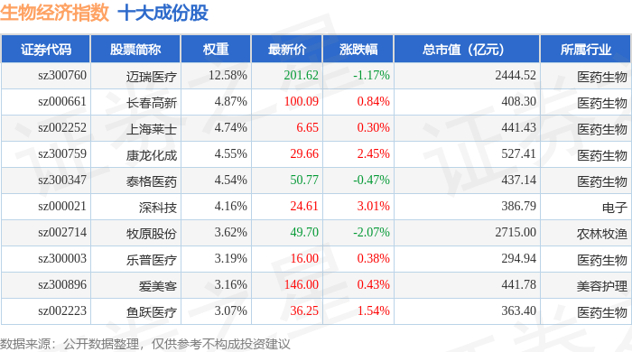 证券之星消息,12月1日,生物经济(970038)指数报收于2159.74点,涨0.36%,成交146.16亿元,换手 率1.03%。当日该指数成份股中,上涨的有38家,九强生物以4.43%的涨幅领涨,下跌的有10家,温氏股 份以2.99%的跌幅领跌。 生物经济(970038)指数十大成份股详情如下: | 证券代码 | 股票简称 | 权重 | 最新价 | 涨跌幅 | 总市值(亿元) | 所属行业 | | --- | --- | --- | --- | --- | --- | --- | | sz300760 | 迈瑞医疗 | 12.58% | 201.62 | -1.17% | 2444.52 | > 医药生物 | | sz000661 | 长春高新 | 4.87% | 100.09 | 0.84% | 408.30 | 医药生物 | | sz002252 | 十麻辣土 | 4.74% | 6.65 | 0.30% | 441.43 | 医药生物 | | sz300759 | 康龙化成 | 4.55% | 29.66 | 2.45% C | 527.41 | 医药生物 | | sz300347 | 表格医药 ...
