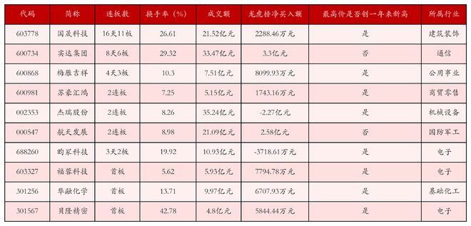 一、强势个股 截至12月1日收盘,上证综指上涨0.65%,收于3914.01点,深证成指上涨1.25%,收于13146.72点,创业 板指上涨1.31%,收于3092.5点。今日沪深两市A股共计75只涨停,综合当前连板数以及当日龙虎榜数 据,其中较为强势的前三只个股分别为:国晟科技(603778)、实达集团(600734)与梅雁吉祥 (600868)。今日强势个股前10位具体数据见下表: | 代码 | 隋称 | 连板数 | 换手率(%) | 成交额 | 龙虎特净买入额 | 最高价是否创一年来新高 | 所属行业 | | --- | --- | --- | --- | --- | --- | --- | --- | | 603778 | 国演科技 | 16天11预 | 26.61 | 21.52亿元 | 2288.46万元 | 是 | 建筑装饰 | | 600734 | 实达集团 | 8天6板 | 29.32 | 33.47亿元 | 3.3亿元 | 종 | 通信 | | 600868 | 梅雁古祥 | 4天3板 | 10.3 | 7.51亿元 | 8099.93万元 | 是 | 公用事业 | | 600981 | ...