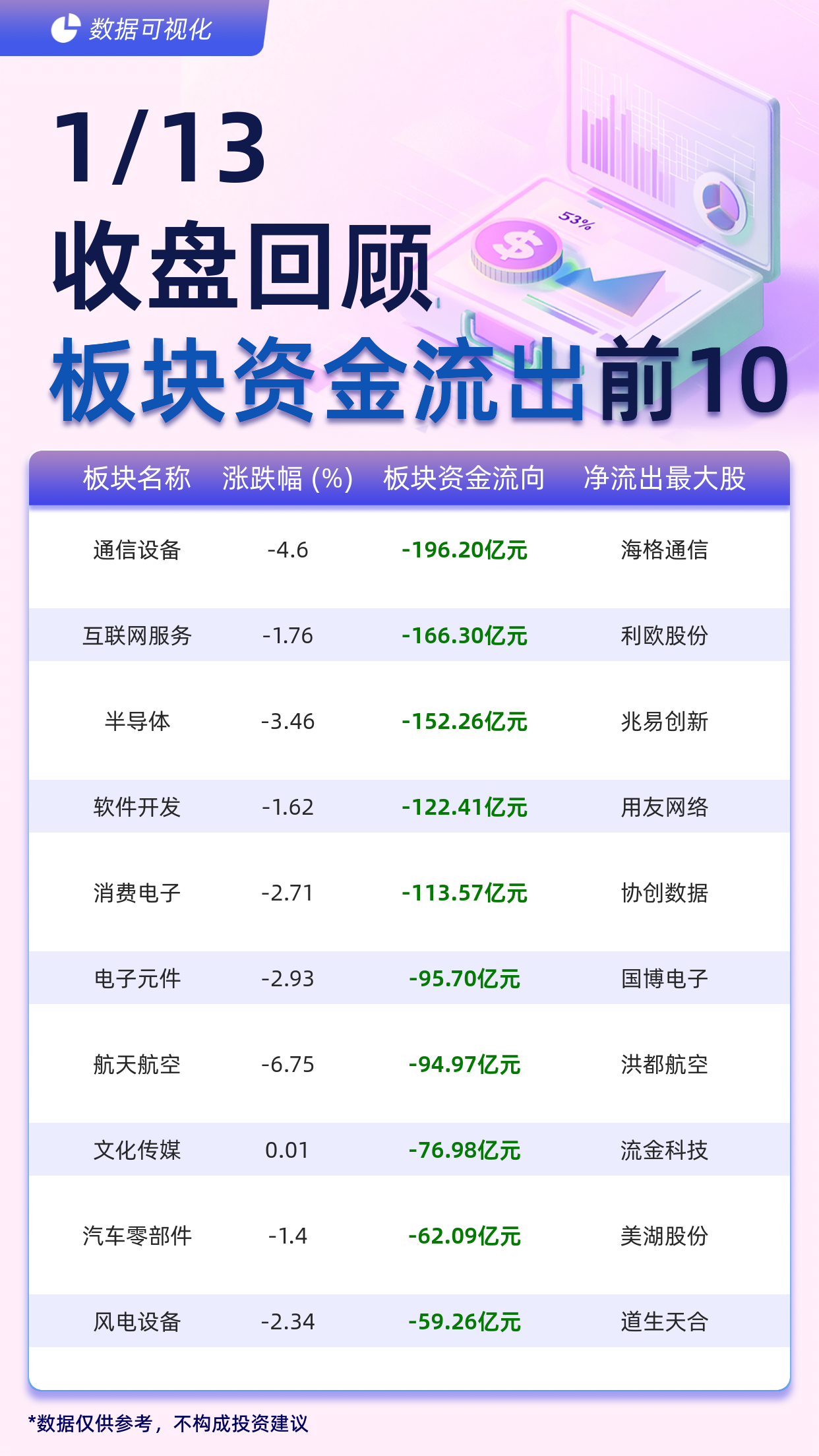 据交易所数据显示,截至1月13日收盘,大盘主力资金净流出1805.56亿元。主力资金流出前十大板块分别为: 通信设备(-196.20亿元)、互联网服务 (-166.30亿元)、 半导体(-152.26亿元)、 软件开发(-122.41亿元)、 消费电子(-113.57亿元)、电子元件(-95.70亿元)、航天航空(-94.97亿元)、 文化 传媒(-76.98亿元)、 汽车零部件(-62.09亿元)、 风电设备(-59.26亿元)。 | 航天航空 | -6.75 | -94.97亿元 | 洪都航空 | | --- | --- | --- | --- | | 文化传媒 | 0.01 | -76.98亿元 | 流金科技 | | 汽车零部件 | -1.4 | -62.09亿元 | 美湖股份 | | 风电设备 | -2.34 | -59.26亿元 | 道生天合 | | *数据仅供参考,不构成投资建议 | | | | | 板块名称 | | 涨跌幅(%) 板块资金流向 | 净流出最大 | | --- | --- | --- | --- | | 通信设备 | -4.6 | -196.20亿元 | 海格通信 | | 互联网服 ...