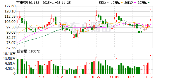 据天眼查APP显示,湖北东田微科技股份有限公司成立于2009年07月24日,注册资本8000万人民币。 (数据宝) (文章来源:证券时报网) 数据宝统计,截至14:00,东田微成交额19.54亿元,创上市以来新高。最新股价上涨20.00%,换手率 28.63%。上一交易日该股全天成交额为10.31亿元。 ...
