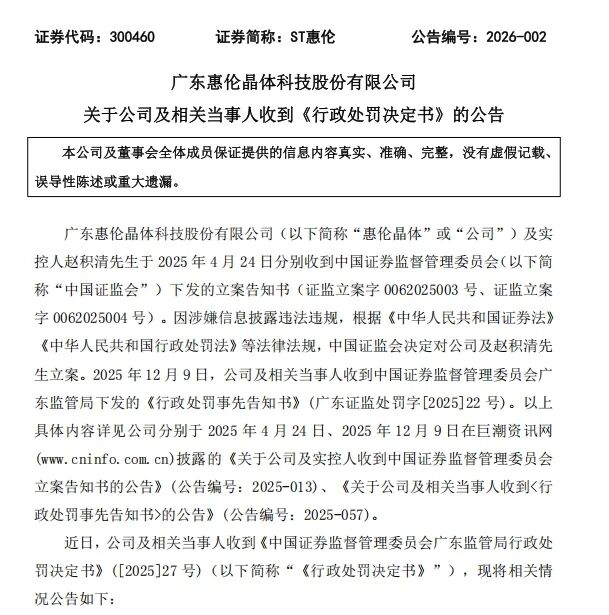 惠伦晶体罚单落地。 1月12日晚间,广东惠伦晶体科技股份有限公司(以下简称"惠伦晶体")发布公告称,其公司及相关当 事人收到《中国证券监督管理委员会广东监管局行政处罚决定书》(以下简称"决定书")。惠伦晶体及 相关人员合计被处罚1140万元。 监管部门查明的违法事实直指两大问题:一是2020年以采购等名义向关联方划转资金2833万元,用于股 东还贷及个人借款,占净资产5.12%,却未在年报中披露,构成重大遗漏;二是2021年至2022年,为掩 盖资金占用,通过虚构采购、虚假销售等方式进行财务造假,两年分别虚增营业收入2549万元和6233万 元。 为掩盖前述资金占用形成的"窟窿",惠伦晶体在随后两年实施了更为复杂的财务造假行为,具体表现 为"虚增成本"与"虚增收入"的双线操作。 决定书显示,惠伦晶体虚增成本费用、虚增收入,2021年、2022年年度报告存在虚假记载。 具体来看,2021年至2022年期间,为掩盖上述资金占用行为,惠伦 晶体 向供应商支付款项后在公司账 面虚构了原材料、固定资产等资产,上述资产以结转原材料成本和摊销费用的形式虚增公司2021年、 2022年成本费用,虚减2021年、2022年利润 ...