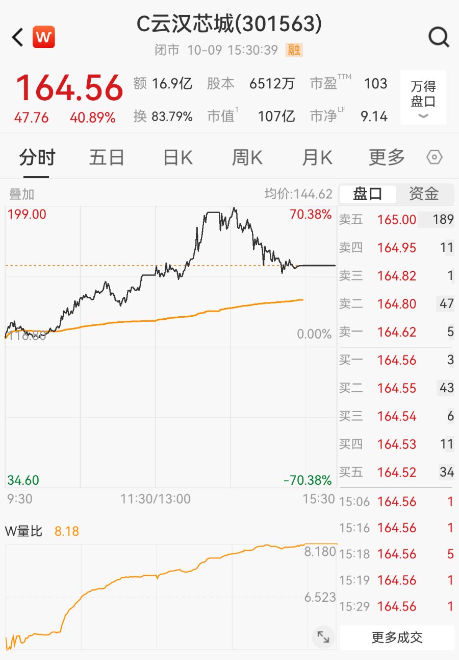 10月9日,次新股C云汉(云汉芯城,301563.SZ)再度成为市场焦点,盘中一度涨超70%,两次触发临停机制,截至收盘报164.56 元/股,全日上涨40.89%。 C云汉芯城(301563) W 闭市 10-09 15:30:39 融 164.56 额 16.9亿 股本 6512万 市盈™ 103 万得 盘口 换 83.79% 市值 107亿 市净" 9.14 47.76 40.89% 分时 五日 日K 月K 月K 童学 (0) 均价:144.62 盘口 资金 叠加 70.38% 卖五 165.00 189 199.00 11 164.95 壶四 卖三 164.82 1 卖二 164.80 47 164.62 5 lak 0.00% 164.56 3 型一 北二 164.55 43 近三 164.54 6 164.53 11 云口 164.52 34 买五 34.60 -70.38% 11:30/13:00 15:30 15:06 164.56 9:30 1 15:16 164.56 1 W量比 8.18 8.180 15:18 164.56 5 15:19 164.56 1 6.523 15:29 16 ...