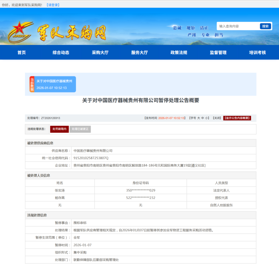 公告显示,中国医疗器械贵州有限公司在参加项目编号:2022-JQXWEM-W1003采购活动中,涉嫌存在违规失信行为。根据军队供应商管 理相关规定,自2026年01月07日起暂停其参加全军物资工程服务采购活动资格。在暂停期内, 法定代表人张宏涛、自然人控股股东无控 股或管理的其他企业暂停参加上述范围军队采购活动,授权代表杨存高暂停代理其他供应商参加上述范围军队采购活动。该公司地址位于 贵州省贵阳市南明区解放路184-186号元和国际商务大厦19层[遵义社区]。 天眼查显示,中国医疗器械贵州有限公司成立于2011年12月,法定代表人为牛海,注册资本13000万人民币,所属行业为电子和电工机械 专用设备制造。其股东中国医疗器械有限公司持股60%,贵州益康庆管理服务有限责任公司持股40%。 中国医疗器械有限公司官网介绍,中国医疗器械有限公司成立于1966年,隶属于世界500强企业中国医药集团有限公司,是国药集团医疗 器械板块战略发展承载者,业务范围覆盖医疗器械研发制造、供应链服务、医疗服务等领域,持续投入医疗器械行业基础设施建设,长期 承担国家医疗器械中央储备重要职能。 2026年1月7日,联勤保障部队后勤部采购管 ...