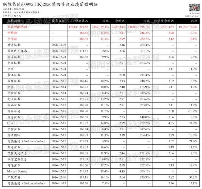 Core Viewpoint - Lenovo Group is expected to report significant revenue and profit growth in Q4 2026, with projected revenue between $17.461 billion and $21.982 billion, representing a year-on-year increase of 2.8% to 29.4% [1][2]. Financial Projections - Projected net profit for Q4 2026 is estimated to be between $223 million and $445 million, showing a substantial year-on-year growth of 148.0% to 395.1% [1][2]. - Adjusted net profit is forecasted to range from $250 million to $485 million, with a year-on-year change of -10.2% to 74.2% [1][2]. Business Segment Performance - AI Business: Revenue from AI-related activities grew by 72% year-on-year, accounting for 32% of total revenue, indicating strong growth potential in personal AI and inference AI [4][5]. - PC Business: IDG segment revenue increased by 14% to $15.8 billion, with PC market share rising by 1 percentage point to 25.3%, and total shipments reaching 19.3 million units [4][5]. - ISG Business: Revenue from ISG grew by 31% to $5.2 billion, with AI server revenue achieving high double-digit growth; strategic restructuring is expected to yield over $200 million in annual cost savings over the next three years [4][5]. Overall Company Performance - Lenovo Group achieved total revenue of approximately $22.204 billion in FY2026 Q3, reflecting an 18% year-on-year increase, while net profit was $5.46 billion, down 21% year-on-year [4][5]. - The company has focused on efficiency optimization and high-end product offerings to drive growth, with adjusted net profit increasing by 36% year-on-year [4][5].