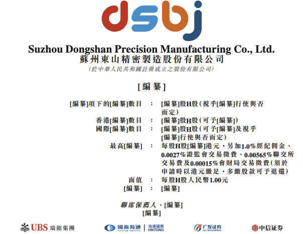 聯席保薦人、[编纂] [測養] UBS 瑞缇集團 (D 國泰培通 | 活動隊 据港交所文件,11月18日,苏州东山精密制造股份有限公司向港交所提交上市申请书,联席保荐人为瑞 银集团、国泰海通、广发证券、中信证券。 Suzhou Dongshan Precision Manufacturing Co., Ltd. 蘇州東山精密製造股份有限公司 (於中華人民共和國註冊成立之股份有限公司) [编纂] (元 | 发班券 瓣中信证券 [编纂]項下的[编纂]數目 [编纂]股H股(視乎[编纂]行使與否 " 而定) 香港[编纂]數目 [编纂]股H股(可予[编纂]) : 國際[编纂]數目 : [编纂]股H股(可予[编纂]及視乎 [编纂]行使與否而定) 最高[编纂] 每股H股[編纂]港元,另加1.0%經紀佣金、 : 0.0027%證監會交易徵費、0.00565%聯交所 交易費及0.00015%會財局交易徵費(須於 申請時以港元繳足,多繳股款可予退還) 每股H股人民幣1.00元 面值 : [甜養] " [測養] ...