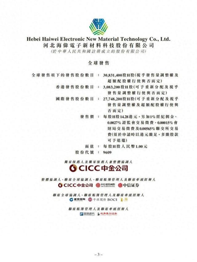 来源:陕西法制网 河北海伟电子新材料科技股份有限公司(简称 "海伟股份"),由中金公司担任公司独家保荐人,已于 2025年11月20日开启全球招股,定于11月28日正式上市发行。 公司核心产品为电容器基膜与金属化膜,电容器基膜作为薄膜电容器的关键组成部分,以其优异的耐电 压性能、高频稳定性和长久使用寿命而被广泛应用。在终端应用方面,这些产品主要服务于新能源汽 车、新能源电力系统、工业设备和家用电器等重要领域。国内的 "双碳" 目标与新能源产业链自主可控 战略已进入深化落地阶段,终端需求迎来爆发期。 | * 球 智 真 下 的 發 悟 股 份 數 目 : 30,831,400股 H 股 平 發售量調整 權 及 | | --- | | 超额配股權行使與否而定) | | 香港發售股份數目 : 3.083.200股目股(可于重新分配及視乎 | | 發售量調整備行使與否面定) | | 國際發售股份數目:27,748,200股H股(可子重新分配及殺乎 | | 發售量調整權及超額配股權行使與 | | 否面定) | | 發售價 : 每股H股14.28港元,另加1%經紀冊金、 | | 0.0027% 證監 何交易做費 · 0. ...