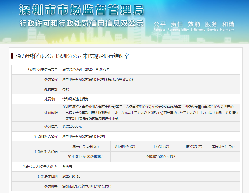 对此,深圳市市场监督管理局光明监管局依据深圳经济特区电梯使用安全若干规定,对通力电梯深圳分公司罚款10000元。行政处罚决定 书文号为深市监光处罚〔2025〕新湖78号。 通力电梯官网介绍,通力成立于1910年,2024年,通力集团的年营业额达111亿欧元,在60多个国家拥有业务,全球平均每天发运台量超 750台,维保台量超170万台,公司B类股票在芬兰赫尔辛基纳斯达克交易所上市。通力电梯称,中国市场是通力全球最大的单一市场。 在2024财年,其销售额占全球销售额超过20%。 齐鲁晚报·齐鲁壹点记者于深圳市市场监督管理局行政处罚公示栏了解到,10月10日,通力电梯有限公司深圳分公司(下称"通力电梯深 圳分公司")收到罚单,处罚机关为深圳市市场监督管理局光明监管局。 | 别市市场监督管理局 | | | | | --- | --- | --- | --- | | 行政许可和行政处罚信用信息双公示 | | | 责任 效能 服务 | | 通力电梯有限公司深圳分公司未按规定进行维保案 | | | | | 行政处罚决定书文号: | 深市监光处罚[2025] 新湖78号 | | | | 处罚名称: | 通力电梯有限公司深圳 ...