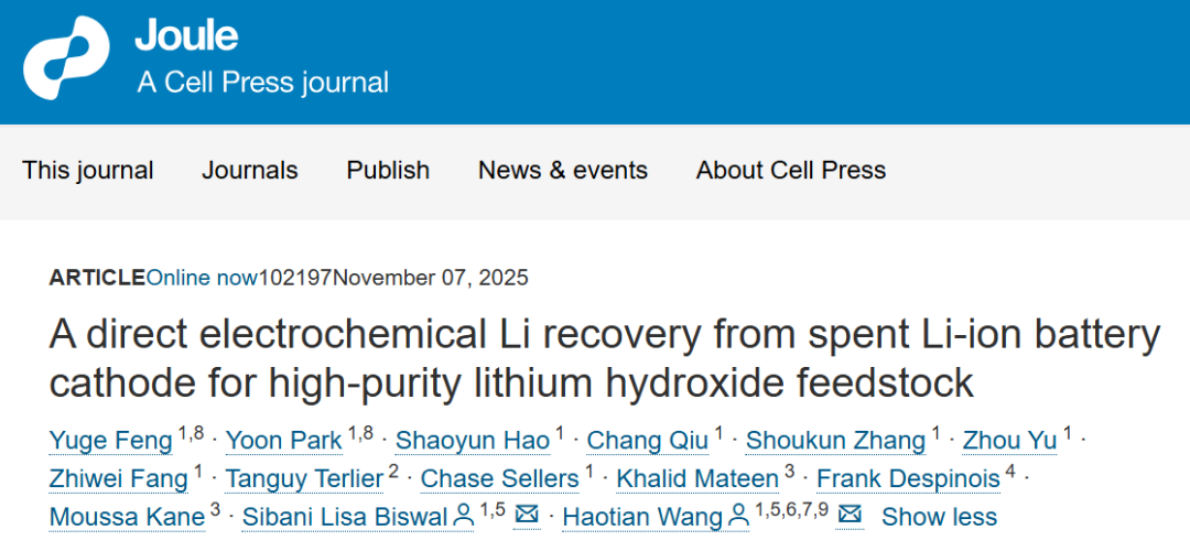 美国莱斯大学研究人员开发出一种新型反应器,可将废旧电池中的锂高效转化为高纯度氢氧化锂,为锂资源回收开辟了一条更清洁、更经济的路径。相关 成果发表于新一期《焦耳》杂志。 新研发的电化学反应器通过再充电方式诱导废弃阴极中的锂离子进入水中,与氢氧化物结合,直接生成高纯度氢氧化锂,大幅简化了回收流程。 这一反应器结构紧凑,在实验中,研究人员将装置缩小至20平方厘米,并连续运行1000小时,处理了57克工业黑色废料。测试结果显示,回收的氢氧化锂 纯度超过99%,可直接用于新电池生产,平均回收率接近90%。 在能耗方面,该技术也表现优异:一种模式下,每千克废料仅消耗103千焦能量,远低于传统酸浸工艺;另一种模式也仅消耗536千焦。此外,这一方法适 用于多种电池类型,包括磷酸铁锂、锂锰氧化物和镍锰钴材料。更值得一提的是,它甚至能直接处理附着在铝箔上的完整磷酸铁锂电极,且无需刮除或预 处理。 团队强调,直接产出高纯度氢氧化锂不仅减少了加工步骤和废弃物,也增强了供应链韧性。 随着电动汽车在全球快速普及,报废电池数量激增,正成为一大环境挑战。传统回收方法不仅能耗高、流程复杂,且通常只能产出碳酸锂,需进一步加工 才能转化为电池制造 ...