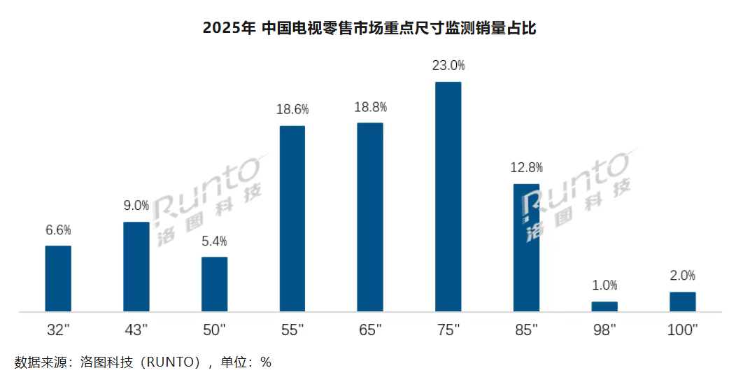 【环球网科技综合报道】1月12日消息,根据洛图科技(RUNTO)最新发布的报告显示,2025年全年,中国电视市场品牌整机的出货量为3289.5万 台,同比2024年下降8.5%。 洛图科技(RUNTO)表示,中国电视市场已经全面进入了大屏时代。2024年出货的平均尺寸为63.5英寸,而2025年则进一步逼近65英寸。 根据洛图科技(RUNTO)零售监测数据显示,2025年,中国电视零售监测市场中,75英寸的零售量占比为23.0%,领先65英寸4.2个百分点,蝉联第 一大尺寸。2024年,中国市场的电视尺寸按销量排位还是75、65、55和43英寸;而到2025年变成了75、65、55和85英寸,全部集中到了中大尺寸。同 时,TOP4尺寸的合并零售量占比超过了七成。超大尺寸85英寸、98英寸和100英寸的零售量份额分别达到12.8%、1.0%和2.0%,同比2024年分别提升 了1.9、0.4和0.8个百分点。 洛图科技(RUNTO)表示,可见,大屏产品凭借更强的沉浸感,成为了存量换机需求的核心选择,面板厂良率提升与成本控制优化则进一步推动大 屏产品价格下探,成为弱势的市场环境下上下游厂商最明确的商机。(思瀚) ...