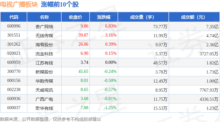 | 代码 | 名称 | 收盘价 | 涨跌幅 | 成交量(手) | 成交额(元) | | --- | --- | --- | --- | --- | --- | | 301551 | 元线传媒 | 37.44 | -1.24% | 6.64万 | 2.49 Z | | 300770 | 新媒股份 | 43.80 | -0.32% | 3.32万 | 1.47亿 | | 600936 | 广西广电 | 3.54 | 0.00% | 10.37万 | 3685.72万 | | 600959 | 江苏有线 | 3.54 | 0.00% | 45.86万 | 1.63亿 | | 601929 | 吉视传媒 | 3.94 | 0.00% | 362.90万 | 14.30 Z | | 002238 | 天威视讯 | 8.35 | 0.36% | 6.36万 | 5342.08万 | | 600037 | 歌华有线 | 7.54 | 0.80% | 14.12万 | 1.07亿 | | 920021 | 流金科技 | 6.67 | 0.91% | 7.91万 | 5333.28万 | | 000665 | 湖北广电 | 6 ...