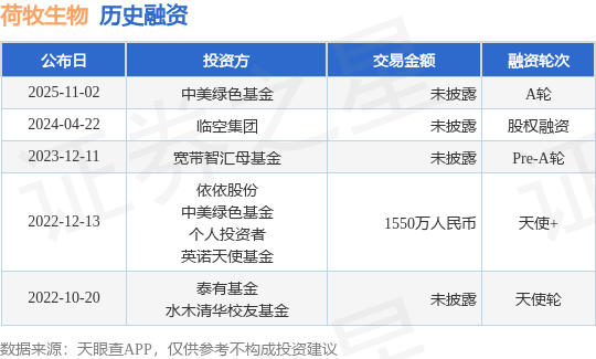 荷牧生物由国内先进的技术开发团队及实力强大的管理团队共同打造,是国内首家专注于动物新型 mRNA疫苗创新型研发企业。致力于新型动物病毒性传染病mRNA疫苗研发,通过不断的产品创新,提 供更安全更有效的新型疫苗。 同时开展精准的动物传染病体外检测试剂研发,建立全面完善的病原检 测及预防解决方案,为全国乃至世界的畜牧业健康发展提供保障。 | 公布日 | 投资方 | 交易金额 | 融资轮次 | | --- | --- | --- | --- | | 2025-11-02 | 中美绿色基金 | 未披露 | A轮 | | 2024-04-22 | 临空集团 | 未披露 | 股权融资 | | 2023-12-11 | 宽带智汇母基金 | 未披露 | Pre-A轮 | | 2022-12-13 | 依依股份 中美绿色真金 | 1550万人民币 | 天使+ | | | 个人投资者 | | | | | 英诺天使基金 | | | | 2022-10-20 | 泰有其余 | 未披露 | 天使轮 | | | 水木清华校友墓金 | | | 证券之星消息,根据天眼查APP于11月2日公布的信息整理,北京荷牧生物科技有限公司A轮融资,融 ...