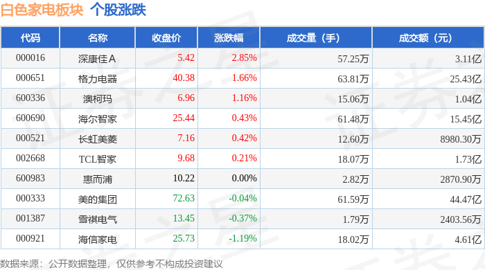 证券之星消息,10月10日白色家电板块较上一交易日上涨0.35%,惠而浦领涨。当日上证指数报收于 3897.03,下跌0.94%。深证成指报收于13355.42,下跌2.7%。白色家电板块个股涨跌见下表: | 代码 | 名称 | 收盘价 | 涨跌幅 | 成交量(手) | 成交额(元) | | | --- | --- | --- | --- | --- | --- | --- | | 600983 | 惠而浦 | 10.45 | 2.25% | 3.68万 | | 3818.60万 | | 002668 | TCL智家 | 9.81 | 1.34% | 16.07万 | | 1.57亿 | | 600690 | 海尔智家 | 25.66 | 0.86% | 57.01万 | | 14.67 乙 | | 000921 | 海信家电 | 25.92 | 0.74% | 15.03万 | | 3.91亿 | | 600336 | 澳柯玛 | 7.01 | 0.72% | 18.83万 | | 1.32亿 | | 000521 | 长虹美菱 | 7.21 | 0.70% | 15.90万 | | 1.15亿 | | 0 ...