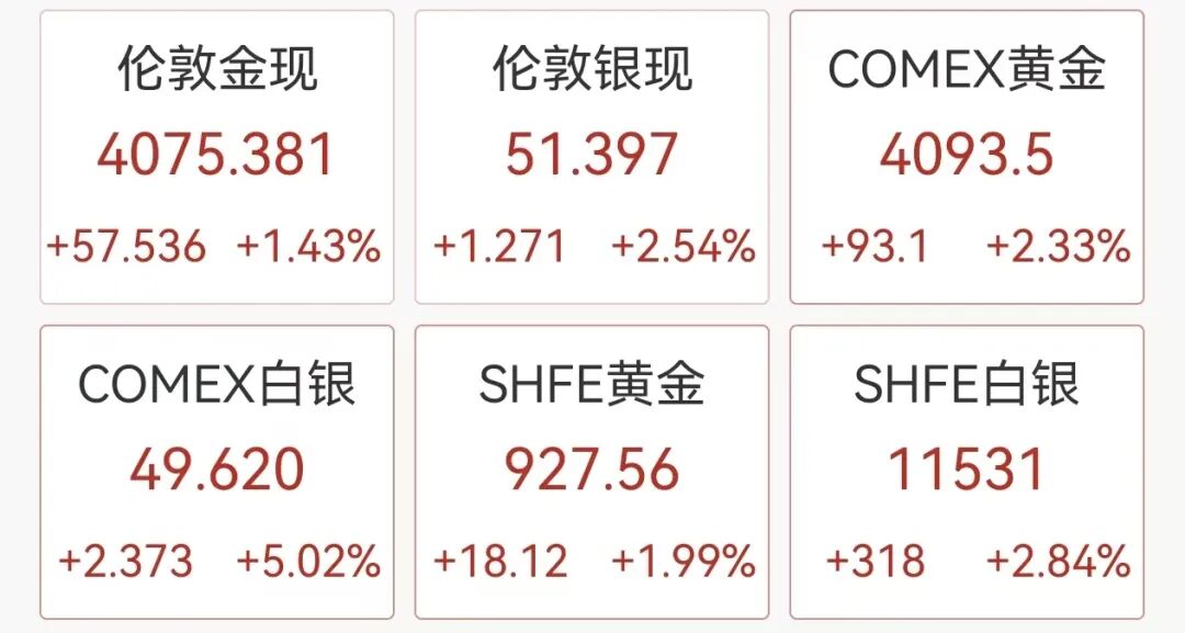 涨涨涨,黄金白银价格还在不断刷新历史新高! 10月13日晚,现货黄金向上触及4080美元/盎司,COMEX黄金期货升破4100美元/盎司,双双再创历史新高。今年以来,现货黄金和COMEX黄金期货分别 累计涨约55%和56%。 现货白银13日也触及51.71美元/盎司。截至10月13日,今年以来,白银价格已飙升逾70%,涨幅碾压黄金。 10月13日,A股贵金属板块飙涨近7%,其中西部黄金(601069)3天2板,招金黄金(000506)、晓程科技(300139)、中金黄金(600489)、赤峰黄金 (600988)等跟涨。 13日晚,美股黄金股盘前走高,科尔黛伦矿业一度涨超7%,哈莫尼黄金、纽曼矿业、Barrick Mining等涨幅居前。 受国际金价影响,国内金店金饰克价突破1190元。据今日金价小程序,周大福金价由前一日的1180元/克上调至1190元/克;周生生金价由前一日的1176元/ 克上调至1188元/克;老庙黄金金价由前一日的1183元/克上调至1189元/克。 | | | 品牌金价 | | | --- | --- | --- | --- | | 品牌黄金价格 | | | 最新:2025.10.1 ...