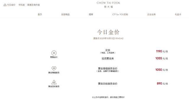 记者丨叶映橙 见习记者林健民 编辑丨刘雪莹 视频丨许婷婷 涨涨涨,黄金白银价格还在不断刷新历史新高! 10月13日晚,现货黄金向上触及4080美元/盎司,COMEX黄金期货升破4100美元/盎司,双双再创历史新高。今年以来,现货黄金和COMEX黄 金期货分别累计涨约55%和56%。 现货白银13日也触及51.71美元/盎司。截至10月13日,今年以来, 白银价格已飙升逾70%,涨幅碾压黄金。 数据截至10月13日20:10 | 10.13 | 周生生 | 1188元/克 | 涨12 | | --- | --- | --- | --- | | 10.13 | 六福珠宝 | 1190元/克 | 涨10 | | 10.13 | 金至尊 | 1190元/克 | 涨10 | | 10.13 | 潮宏基 | 1190元/克 | 涨10 | | 10.13 | 老凤在 | 1182元/克 | 涨10 | | 10.13 | 老庙黄金 | 1189元/克 | 涨6 | | 10.13 | 菜百首饰 | 1122元/克 | 涨12 | | 10.13 | 周六福 | 1129元/克 | 涨6 | | 10.13 | 周大生 | ...