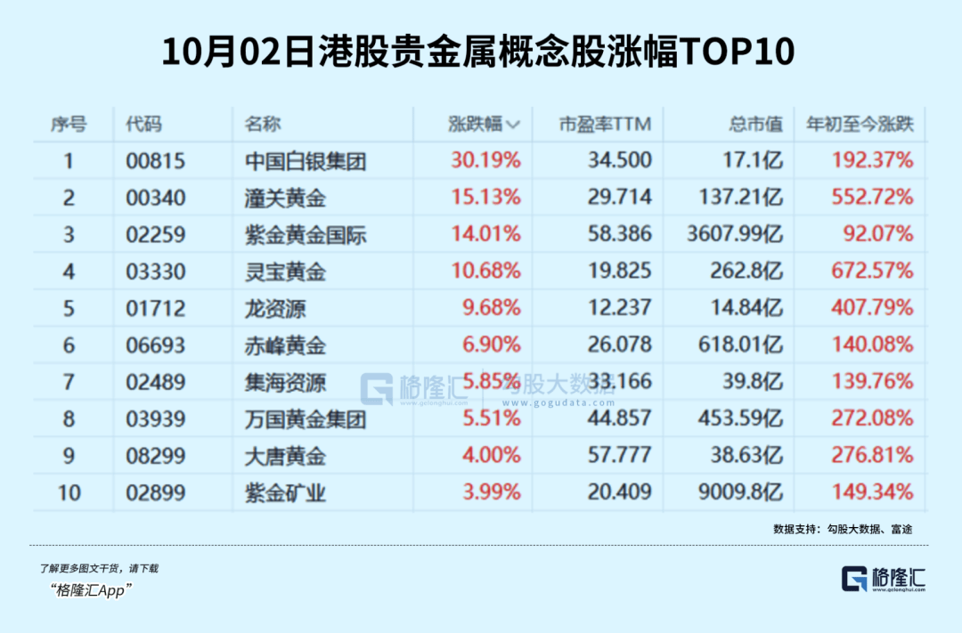 来源:环球老虎财经app 黄金白银资产,又涨疯了! 10月2日,港股国庆假期开市首日,贵金属概念全线大涨,板块中多只黄金股涨幅超10%,其中中国白银集团更是大涨30%,创出近4年新高。 | 序号 | 代码 | 名称 | 涨跌幅 ▽ | 市盈率TTM | 总市值 | 年初至今涨跌 | | --- | --- | --- | --- | --- | --- | --- | | 1 | 00815 | 中国白银集团 | 30.19% | 34.500 | 17.1亿 | 192.37% | | 2 | 00340 | 潼关黄金 | 15.13% | 29.714 | 137.21亿 | 552.72% | | 3 | 02259 | 紫金黄金国际 | 14.01% | 58.386 | 3607.99亿 | 92.07% | | 4 | 03330 | 灵宝黄金 | 10.68% | 19.825 | 262.8亿 | 672.57% | | 5 | 01712 | 龙资源 | 9.68% | 12.237 | 14.84亿 | 407.79% | | 6 | 06693 | 赤峰黄金 | 6.90% | 26.0 ...