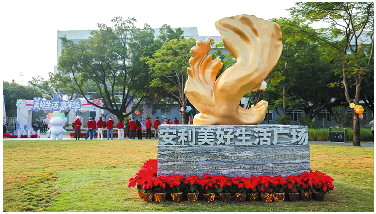 12月5日,"安利美好生活广场" 落成仪式暨安利(中国)三十周年庆典在广州举行,安利董事会联 合主席史提夫·温安洛和德·狄维士、安利全球总裁兼首席执行官迈克尔·尼尔森、安利(中国)总裁余放 出席仪式并参观广场,广州开发区、黄埔区相关领导参加,共同见证安利(中国)的又一发展里程碑, 回顾三十年来广州城市发展所取得的辉煌成就。 "安利美好生活广场"位于广州市黄埔区,由广州开发区管委会、广州市黄埔区人民政府与安利公司 共建。广场毗邻安利广州生产基地,沿扶胥古运河而建,园区种植的100棵异木棉挺立绽放。广场内设 有安利码头、安利剧场、健身步道和运动设施,2.15万平方米的滨水空间成为一片充满活力的户外休闲 活动场所。 活动现场,安利美好生活社群主理人和广州传统美食商户共同打造的美好生活市集,向市民传播健 康、文明、绿色、美好的生活理念。广场"运启繁花"雕塑上镌刻"以花为媒,以水为脉,共筑美好未 来"的标语,记录着这片空间的设计理念与愿景,寓意政企合作共创美好未来,携手共赴广阔前程。 "投资中国就是投资未来,与中国同行就是与机遇同行。"安利全球总裁兼首席执行官迈克尔·尼尔 森盛赞安利(中国)30年来"远超预期"的成就。 ...
