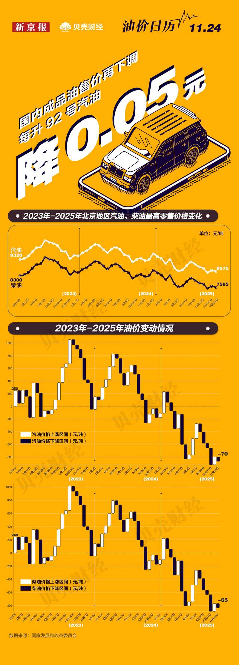 11月24日,国内期货市场原油主力合约2601早盘跌幅居前,最低报442.5元/桶,逼近近年低点。 油价低迷影响下,成品油价格也面临下行。11月24日24时,国内成品油零售限价将再迎调价窗口。本计 价周期以来(2025年11月10日24时至2025年11月24日24时),国际原油未走出单边行情,整体呈现宽幅波 动走势,受此影响,国内参考的原油变化率始终在负值范围内波动,成品油零售限价或遇年内第十次下 调。 "本计价周期以来,市场传出美国将和欧洲某国举行和谈,受到此消息影响,油价在宽幅波动中承压调 整,地缘油价回吐,但美国原油库存意外减少340万桶,且美国单周的汽油需求和馏分油需求环比也出 现增加,表明短期石油需求短时期仍有较强支撑,对国际油价形成强底部支撑。"卓创资讯(301299) 成品油分析师高青翠表示,截至11月21日收盘,国内第10个工作日参考原油变化率-1.50%,11月24日24 时汽、柴油零售限价每吨分别下调70元、65元,升价92#汽油、95#汽油、0#柴油分别下调0.05元、0.06 元、0.06元。 隆众资讯数据也显示,以油箱容量50L的普通私家车计算,本次调价后,车主们加满一箱油将少花2 ...