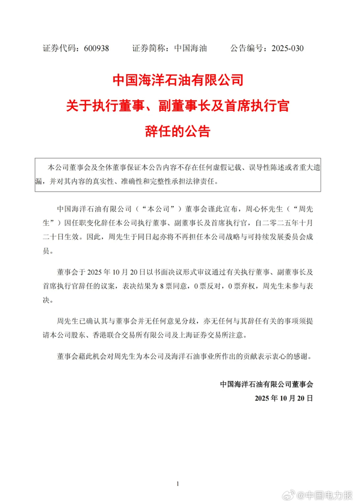【周心怀辞任】10月20日,中国海洋石油有限公司关于执行董事、副董事长及首席执行官辞任的公告 称,中国海洋石油有限公司董事会谨此宣布,周心怀先生因任职变化辞任本公司执行董事、副董事长及 首席执行官,自二零二五年十月二十日生效。因此,周先生于同日起亦将不再担任本公司战略与可持续 发展委员会成员。(来源:上海证券交易所、中国海油) 证券简称:中国海油 公告编号:2025-030 证券代码:600938 中国海洋石油有限公司("本公司")董事会谨此宣布,周心怀先生("周先 生")因任职变化辞任本公司执行董事、副董事长及首席执行官,自二零二五年十月 二十日生效。因此,周先生于同日起亦将不再担任本公司战略与可持续发展委员会成 员。 董事会于2025年10月20日以书面决议形式审议通过有关执行董事、副董事长及 首席执行官辞任的议案,表决结果为8票同意,0票反对,0票弃权,周先生未参与表 决。 周先生已确认其与董事会并无任何意见分歧,亦无任何与其辞任有关的事项须提 请本公司股东、香港联合交易所有限公司及上海证券交易所注意。 董事会藉此机会对周先生为本公司及海洋石油事业所作出的贡献表示衷心的感谢。 中国海洋石油有限公司董事会 ...