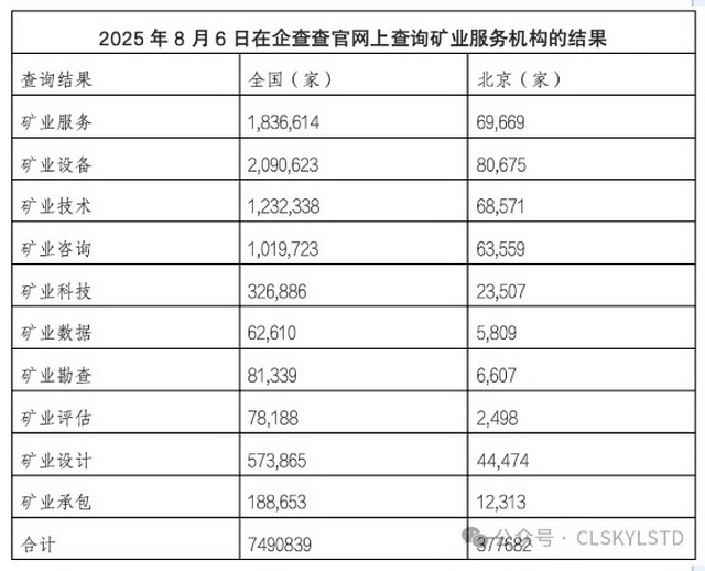当前,国家对保障矿产资源安全的重视程度前所未有。 农工党北京市委课题组日前建议在北京建设"矿业硅谷",使之成为矿业新质生产力的培育基地和新经济 增长点。 课题组负责人、农工党北京市委社会和法治工作委员会委员曹旭升向第一财经记者透露,"正在推进北 京矿业服务一体化产业园建设",拟联合50-100家矿业服务机构共同建设产业园。根据该课题组名单, 成员包括农工党多位党员和矿业行业多位专家。 "矿产资源安全是我国国家安全的重要组成部分,矿业服务机构是保障我国矿产资源安全和培育矿业新 质生产力的决定性力量。"曹旭升说,当前,国家对保障矿产资源安全的重视程度前所未有,矿产资源 的勘查开发、生态修复、安全保障、矿业走出去以及矿业新质生产力的培育,都离不开矿业服务机构。 我国矿业服务机构专业多、领域广、产业链长。曹旭升介绍,课题组用"服务""设备""技术""咨询""评 估"等关键词查询,结果显示,在北京注册的矿业服务市场主体总数为37.77万家,扣除重叠、注销和吊 销、失信和停业部分,北京正常经营的矿业服务市场主体超过3万家。 | | 2025年8月6日在企查查官网上查询矿业服务机构的结果 | | | --- | --- | ...