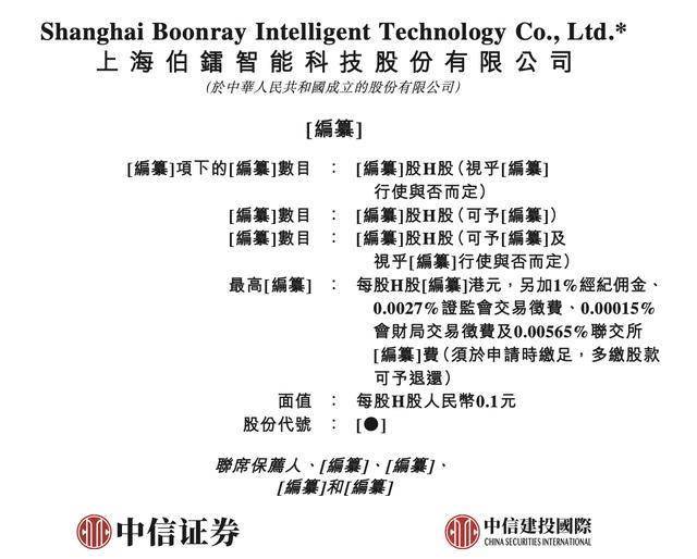 | 精囊]項下的[繼續]數目 | | :[編纂]股H股(視乎[編纂] | | --- | --- | --- | | | | 行使與否而定) | | [编纂]數目 | .. | [編纂]股H股(可予[編纂]) | | [編纂]數目 | .. | [編纂]股H股(可予[編纂]及 | | | | 視乎[編纂]行使與否而定) | | 最高[编纂] | .. | 每股H股[編纂]港元,另加1%經紀佣金、 | | | | 0.0027%證監會交易徵費、0.00015% | | | | 會財局交易徵費及0.00565%聯交所 | | | | [編纂]費(須於申請時繳足,多繳股款 | | | | 可予退還) | | 面值 | : | 每股H股人民幣0.1元 | | 股份代號 | : [0] 聯在但蓋 、[é質]、[é質], | | 瑞财经 吴文婷1月29日,上海伯镭智能科技股份有限公司(以下简称"伯镭科技")在港交所递交招股 书,中信证券、中信建投国际为其联席保荐人。 根据灼识谘询的资料,于2024年,按出货量及收入计,伯镭科技是全球最大的纯电自动驾驶矿卡提供 商,而按采用公司解决方案的矿山累计数量计,截至2024年12月 ...