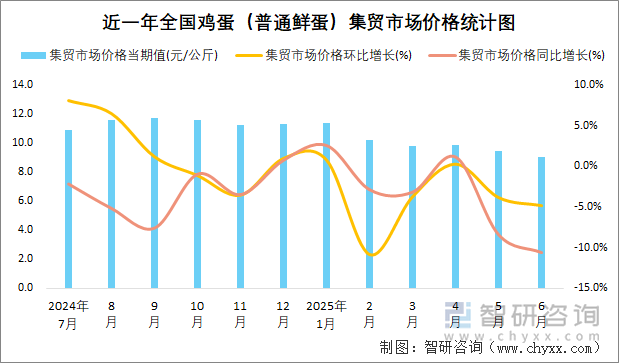 2025年6月全国鸡蛋(普通鲜蛋)集贸市场价格当期值9元/公斤,同比下滑10.6%