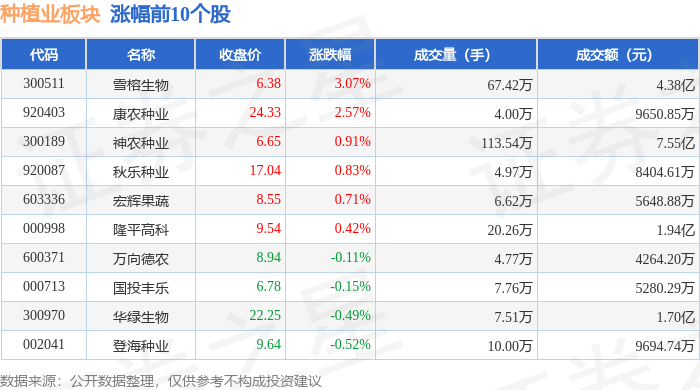 从资金流向上来看,当日种植业板块主力资金净流出8318.76万元,游资资金净流入1.32亿元,散户资金 净流出4915.25万元。种植业板块个股资金流向见下表: | 代码 | 名称 | 主力净流入(元) | | 主力净占比 游资净流入 (元) | | 游资净占比 散户净流入(元) | | 散户净占比 | | --- | --- | --- | --- | --- | --- | --- | --- | --- | | 300189 神农种业 | | | 2247.36万 | 2.98% | 783.80万 | 1.04% | -3031.16万 | -4.01% | | 920403 康农种业 | | | 1802.69万 | 18.68% | 430.27万 | 4.46% | 114.26万 | 1.18% | | 002215 | 诺普信 | | 1138.46万 | 5.32% | 1619.40万 | 7.57% | -2757.85万 | -12.89% | | 300970 华绿生物 | | | 761.66万 | 4.49% | 317.36万 | 1.87% | -1079.02万 | -6 ...