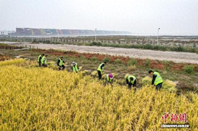 日,工人在天津港东疆港区收获"海水稻"。中新社记者 佟郁 摄 10月15日,工人在天津港东疆港区收获"海水稻"。据了解,海水稻,又称耐盐碱水稻,是在现有自然存 活的高耐盐碱野生稻的基础上,利用杂交育种技术,选育出能在盐度较高的土壤中生长的水稻品种。 2024年,天津港集团与天津农学院合作,在东疆港区开辟3000平方米盐碱地进行海水稻的种植试验。 (无人机照片)中新社记者 佟郁 摄 10月15 10月15日,工人在天津港东疆港区收获"海水稻"。(无人机照片)中新社记者 佟郁 摄 ...