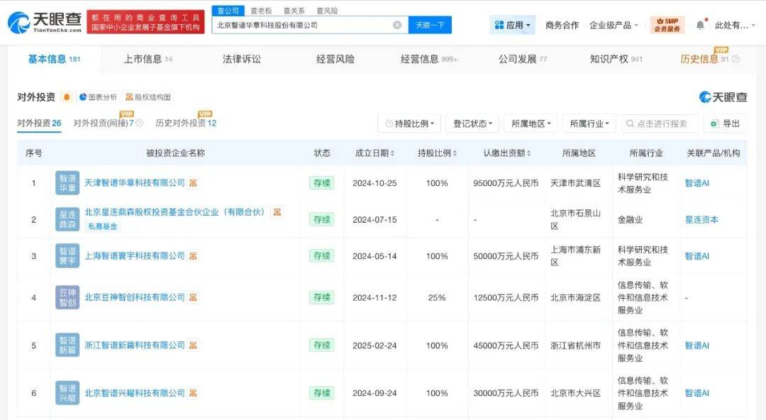 北京智谱华章科技股份有限公司在香港联合交易所挂牌上市,这意味着全球首家以通用人工智能(AGI)基座模型为核心业务的上市公司花落中国 | | | | 查老板 菌关系 酸公司 | 窗风险 | | | | | | | | --- | --- | --- | --- | --- | --- | --- | --- | --- | --- | --- | | | | 都在用的 或 亚 道 询 工 目 图家中小企业发展子基金旗下机构 | 北京智谱华覃科技股份有限公司 | | නු | 天眼一下 | 體 应用 · | 商务合作 企业级产品 · | Q SWIP 哈瑟恩奇 | ▲ 此处有 ... ▼ | | 基本信息 181 | | 上市信息 14 | 法律诉讼 | 经营风险 | | 经营信息 999+ | 公司发展 77 | | 知识产权 941 | 历史信息 91 0 | | 对外投资 @ ●图表分析 品股权结构图 | | | | | | | | | | 花天眼直 | | 对外投资26 | | 对外投资(间接)7 历史对外投资12 | | | | 2持股比例 · | 登记状态。 所属地区 · | 所属行业。 | Q 点击 ...