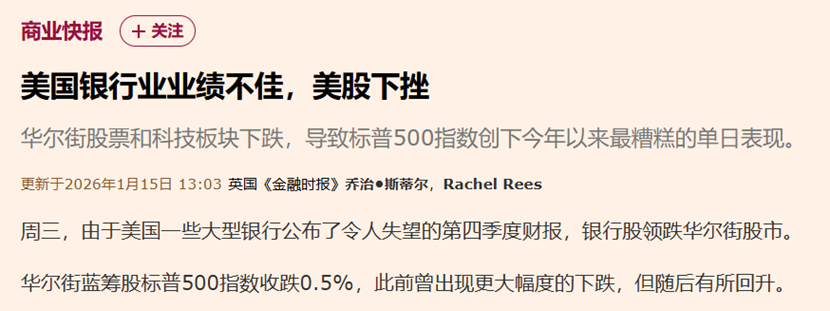 【环球网财经综合报道】北京时间1月16日凌晨,美国三大股指小幅收涨,道指涨0.6%报49442.44点,标普500指数涨 0.26%报6944.47点,纳指涨0.25%报23530.02点。高盛集团涨超4%,英伟达涨逾2%,领涨道指。万得美国科技七巨头 指数涨0.2%,脸书涨近1%,亚马逊涨0.65%。 公开数据显示,美国六大银行在2025年进行了超过1400亿美元的派息和股票回购,超过2019年创下的纪录。其中摩根 大通回购了超过300亿美元股票,创下华尔街银行最高纪录,且规模是该行两年前回购额的三倍多。银行业预计这一 势头将在今年持续。 《金融时报》指出,尽管花旗在第四季度的营收同比增长2%,但利润仍下降了13%;富国银行公布的净利润低于预 期,引发市场对银行业绩的担忧。 但另一方,美国大型银行在第四季度财报中表现疲软,富国银行和花旗集团的利润分别下降,导致银行股领跌,标普 500指数收跌0.5%。 《金融时报》发文称,由于美国一些大型银行公布了令人失望的第四季度财报,银行股领跌华尔街股市,其中富国银 行(Wells Fargo)和花旗(Citi)是表现最差的公司之一,分别下跌4.7%和3.3%。 ...