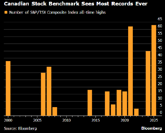 若回望今年4月初的市场态势,加拿大股票市场最终交出本世纪第二佳年度成绩单,这一结果着实出人 意料。 彼时,唐纳德·特朗普刚刚出台自大萧条时期以来最严苛的关税政策,此举严重阻碍贸易流通,还撕毁 了此前他主导协商达成的贸易协定。这位美国总统甚至公开扬言要吞并加拿大,这一言论给加美这两个 长期盟友间的关系蒙上难以想象的紧张阴影。与此同时,加拿大国内的政治动荡也加剧了市场不安情 绪。 随后,特朗普暂缓推行其最具惩罚性的关税政策。技术官僚出身的马克·卡尼接任加拿大总理,此举缓 解了金融市场的恐慌情绪,也缓和了与特朗普政府之间的紧张关系。而事实证明,以矿业企业及国际知 名金融机构为支柱的加拿大股票市场,恰好能在特朗普构建的"新世界秩序"所引发的混乱格局中占据有 利位置。 标普/多伦多证交所综合指数自4月8日的低点反弹,涨幅超40%,全年最终收涨28%。这是该指数自 2009年以来的最佳年度表现,彼时受金融危机后市场反弹的推动,该指数曾录得31%的涨幅。在年度最 后七个月的持续攀升过程中,该指数累计创下63次收盘历史新高,刷新纪录数量之最。 矿业与银行股是此次上涨的核心动力,受黄金、白银、铜、钯金等贵金属价格上涨的提振,原 ...