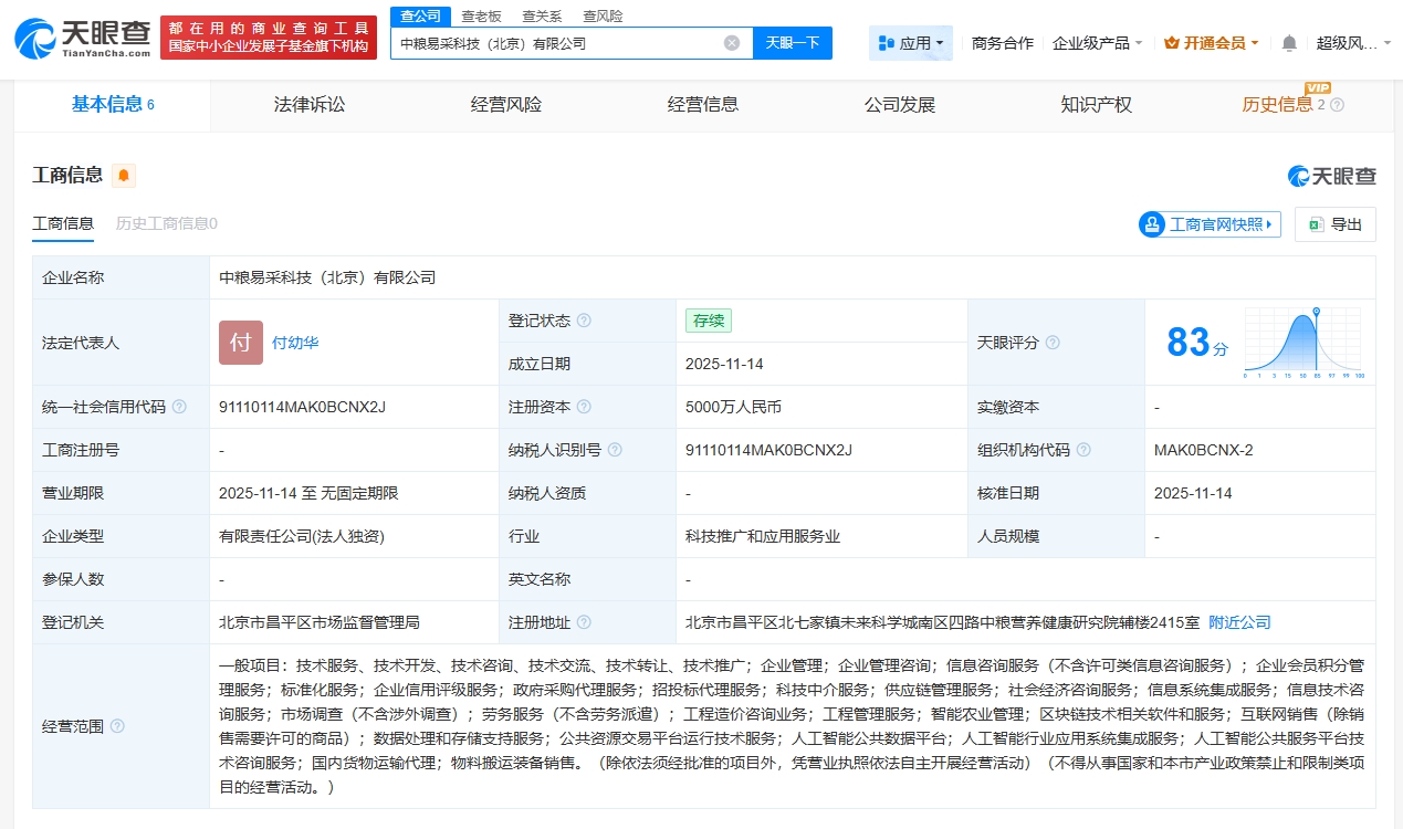Group 1 - The core point of the news is the establishment of COFCO Easy Procurement Technology (Beijing) Co., Ltd., which is fully owned by COFCO Group and has a registered capital of 50 million RMB [1][2]. - The company is engaged in various services including government procurement agency services, bidding agency services, technology intermediary services, and supply chain management services [1][2]. - The legal representative of the newly established company is Fu Youhua, and it is registered in the Changping District Market Supervision Administration of Beijing [2]. Group 2 - The company operates under the industry of technology promotion and application services [2]. - The registered address of the company is located in the Future Science City, Changping District, Beijing [2]. - The company has a comprehensive business scope that includes technology services, enterprise management consulting, information consulting services, and various other related services [2].