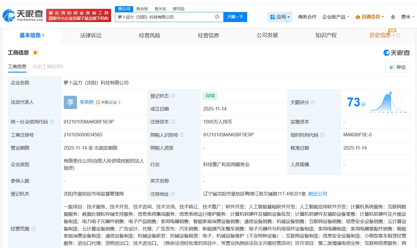 每经AI快讯,天眼查工商信息显示,近日,萝卜运力(沈阳)科技有限公司成立,法定代表人为李英照,注册资本1000万元人民币,经营范围包括人工智能基 础软件开发、人工智能应用软件开发、计算机系统服务等。股东信息显示,该公司由萝卜快跑关联公司萝卜运力(北京)科技有限公司全资持股。 | 天眼管 | 都在用的 商 业 查 询 工 具 | 更公司 | 童老板 音关系 | 童风险 | | | | | | --- | --- | --- | --- | --- | --- | --- | --- | --- | | 国家中小企业发展子基金旗下机构 | | 萝卜运力 (沈阳) 科技有限公司 | | | × | 天眼一下 | 船 应用 ▼ | 商务合作 | | 基本信息 5 | 法律诉讼 | | 经营风险 | | 经营信息 | | 公司发展 | 知 | | 股东信息 1 ⑦ ● 品 股权结构 | | | | | | | | | | 序号 | | 股东名称 | | | | | 持股比例÷ | 认缴出资额(7 | | 控股股东 | 萝卜运力(北京)科技有限公司 | | | | | | 100% | | | | 都在用的商业查询工具 ...