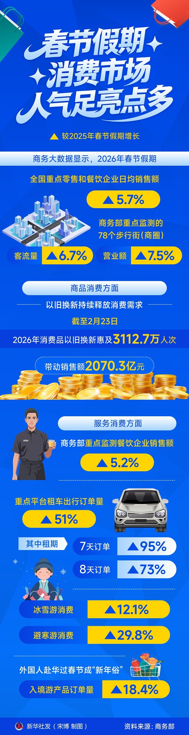 ▲ 较2025年春节假期增长 商务大数据显示, 2026年春节假期 全国重点零售和餐饮企业日均销售额 ^ 5.7% 商务部重点监测的 78个步行街(商圈) 6.7% 营业额 △7.5% 客流量 商品消费方面 以旧换新持续释放消费需求 记者2月24日从商务部获悉,春节假期,各地商务部门深入组织开展"乐购新春"春节特别活动,加 力实施消费品以旧换新、有奖发票等政策,持续释放假日消费潜力。 新华社发 宋博 制图 截至2月23日 2026年消费品以旧换新惠及3112.7万人次 带动销售额2070-3亿元 IDHUL 服务消费方面 商务部重点监测餐饮企业销售额 5.2% 重点平台租车出行订单量 51% 其中相期 95% 7天订单 * 7.3% 8天订单 12.1% 冰雪游消费 ...