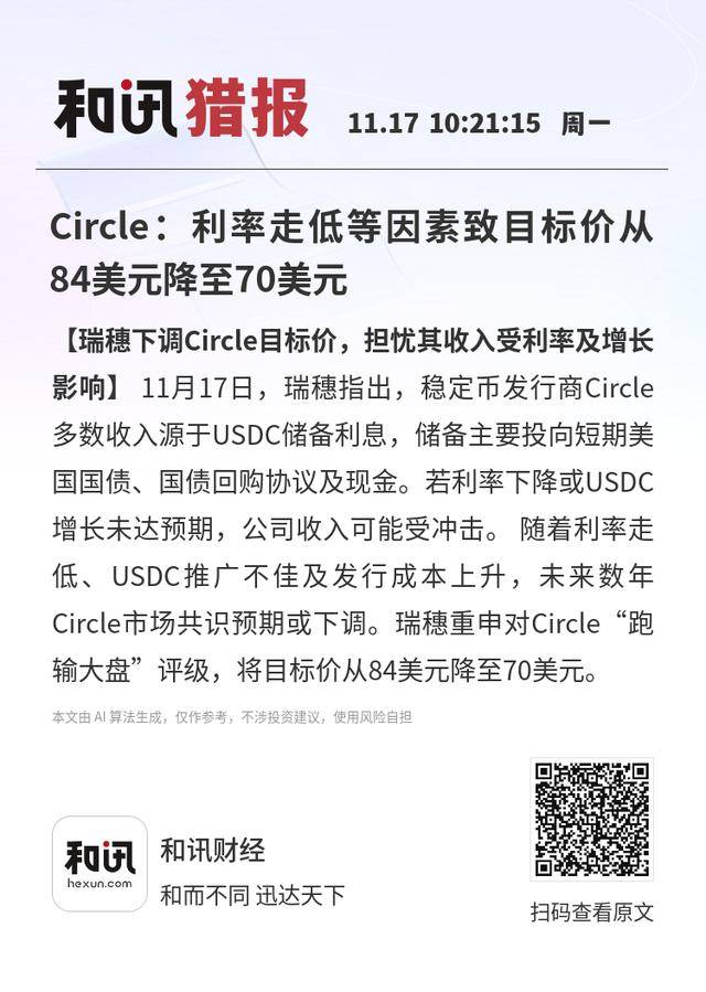【瑞穗下调Circle目标价,警示利率与市场风险】11月17日,瑞穗指出,稳定币发行商Circle多数收入源 于USDC储备利息,其储备主要投向短期美债、国债回购协议及现金。若利率下降或USDC增长未达预 期,公司收入将受影响。随着利率走低、USDC推广不佳及发行成本上升,未来数年Circle市场共识预 期大概率下调。瑞穗重申对Circle"跑输大盘"评级,还将目标价从84美元降至70美元。 本文由 AI 算法生成,仅作参考,不涉投资建议,使用风险自担 ...