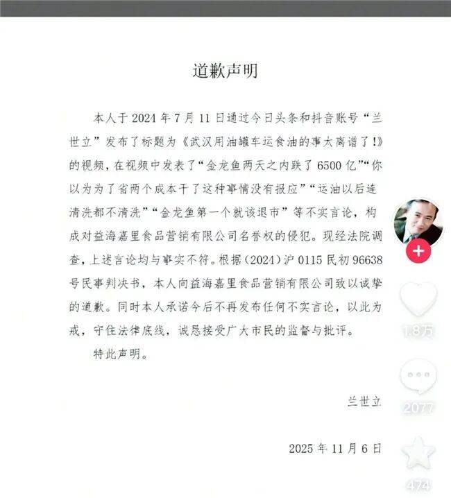 Core Points - The former Hubei tycoon Lan Shili has publicly declared war on the food oil giant Jinlongyu, citing a personal financial crisis stemming from a legal dispute over the transportation of edible oil [1][5] - The conflict originated from a July 2024 incident where it was reported that oil tankers transported edible oil without proper cleaning, raising safety concerns [1][5] - Following a court ruling, Lan Shili was ordered to pay 10,000 yuan in damages to Yihai Kerry, the brand owner of Jinlongyu, but mistakenly transferred 100,000 yuan instead [3][4] Legal Dispute - The initial legal action was taken by Yihai Kerry against Lan Shili for defamation after he made claims about the safety of their products on social media [1][3] - The Shanghai courts ruled in favor of Yihai Kerry, leading to a compensation order against Lan Shili [1][3] - Despite fulfilling the court's compensation order, Lan Shili accused Yihai Kerry of bad faith for not reporting the receipt of the payment and continuing to seek enforcement actions against him [5][7] Financial Implications - Lan Shili's financial troubles were exacerbated when his bank account was frozen due to the enforcement actions taken by Yihai Kerry, which he claims nearly left him homeless [5][7] - He is now seeking to recover the excess payment made and is pursuing further legal action against Yihai Kerry for what he describes as unjust enrichment [7]