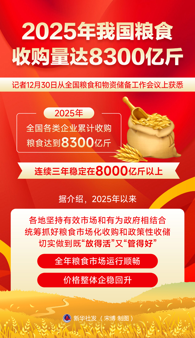 据介绍,2025年以来 2025年我国粮食 收购量达8300亿元 记者12月30日从全国粮食和物资储备工作会议上获悉 2025年 全国各类企业累计收购 粮食达到8600亿斤 连续三年稳定在8000亿斤以上 各地坚持有效市场和有为政府相结合 统筹抓好粮食市场化收购和政策性收储 切实做到既"放得活"又"管得好" 全年粮食市场运行顺畅 价格整体企稳回升 新华社发(宋博 制图) 记者12月30日从全国粮食和物资储备工作会议上获悉,2025年全国各类企业累计收购粮食达到8300 亿斤,连续三年稳定在8000亿斤以上。 新华社发 宋博 制图 ...