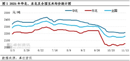 具体来看,四季度是东北新季玉米集中上市期,基层农户的售粮进度决定了市场供应量。据卓创资讯调 研了解,截至11月13日,东北产区平均基层售粮进度为18%,较去年同期偏快2个百分点。其中,辽宁 进度明显快于去年同期,主要原因是新粮上市时间早,上市初期市场价格高于去年,且直收粮不宜存 储,农户售粮积极性较高。但吉林、黑龙江售粮进度较慢则主要受到气温下降,低水份(水份25%及以 下)易储存,以及下游贸易环节、深加工企业等收购主体积极收购的影响。整体来看,随着市场价格走 高,基层农户惜售情绪浓厚且一致,尤其在11月中旬表现较为明显。 另从下游收购情况来看,东北产区主要港口锦州港的集港量也能反映产区售粮进度和贸易环节售粮意 愿。卓创资讯监测数据显示,截至11月15日,11月锦州港晨间玉米集港量分别为汽运6804车、火运341 节,较去年11月同期降幅分别为31.82%、86.29%。由于今年华北新季玉米质量不稳定,饲用玉米需依 靠东北粮源进行补充,以及锦州港价格优势不明显,东北部分粮源通过火运、汽运流入华北市场。 进入11月东北产区玉米价格缓慢上涨,且涨幅大于华北和全国平均水平,根本原因是基层惜售情绪较为 一致,市场供应 ...