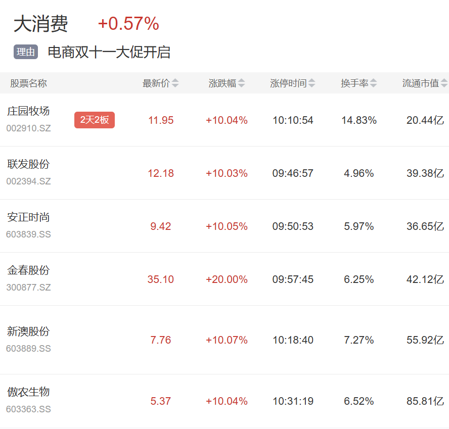 10月10日,大消费板块大涨,庄园牧场2连板,联发股份、安正时尚、新澳股份等涨停。 | 大消费 | +0.57% | | | | | | | --- | --- | --- | --- | --- | --- | --- | | 理由 | 电商双十一大促开启 | | | | | | | 股票名称 | 最新价 = | | 涨跌幅 = | 涨停时间 ◆ | 换手率 = | 流通市值 ◆ | | 庄园牧场 002910.SZ | 2天2板 | 11.95 | +10.04% | 10:10:54 | 14.83% | 20.44亿 | | 联发股份 002394.SZ | | 12.18 | +10.03% | 09:46:57 | 4.96% | 39.38亿 | | 安正时尚 603839.SS | | 9.42 | +10.05% | 09:50:53 | 5.97% | 36.65亿 | | 等星股份 300877.SZ | | 35.10 | +20.00% | 09:57:45 | 6.25% | 42.12亿 | | 新澳股份 603889.SS | | 7.76 | +10.07% | 10:18: ...