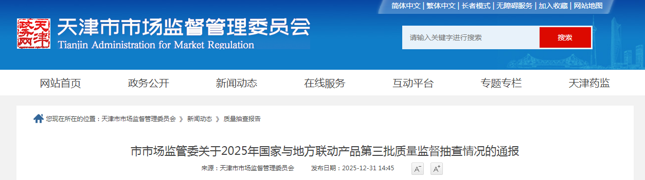 天津市市场监督管理委员会通报2025年国家与地方联动产品第三批质量监督抽查情况