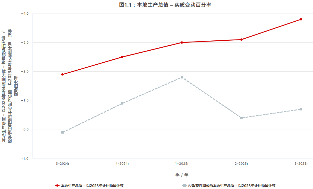 11月14日,香港特区政府统计处公布,本地生产总值在2025年第3季较上年同期实质上升3.8%,而上季的升幅为3.1%。经季节性调整后,本地生产总值 在2025年第3季较上季上升0.7%。 图2.1-C:货品进口(离岸价)及服务输入 - 按年实质变动百分率 +7.0 +6.0 生产总值组成部分 – 以2023年环比物国计算 – 按年变动 +5.0 +4.0 +3.0 +2.0 +1.0 0.0 -1.0 –2.0 1-2025r 3–2025r 4-2024r 2–2025r 3-2024r 季 / 年 ❤ 私人消费开支 ● 政府消费开支 ❤ 本地固定资本形成总额 图2.1-B:货品出口(离岸价)及服务输出 - 按年实质变动百分率 +14.0 +12.0 生产总值组成部分 – 以2023年环比物量计算 – 按年变动 +10.0 +8.0 分率 +6.0 +4.0 +2.0 0.0 3-2024r 4-2024r 1-2025r 2-2025r 3-2025r 季 | 年 图2.1-A : 私人消费开支、政府消费开支及本地固定资本形成总额 - 按年实质变动百分率 +14.0 +12.0 地生产总值组成部分 – ...