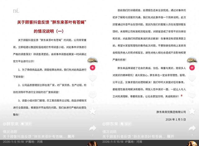 1月5日下午,胖东来在官方抖音账号发布《关于顾客抖音反馈'胖东来茶叶有苍蝇'的情况说明 (一)》。 3、调查小组对部门管理、员工售后服务全过程,商品详细情况进行全面调查,根据各环节出现的问 题,我们会进行严格的处理及整改! 胖东来称,目前我们的详细调查、处理报告还未全部完成,通过对事件的初步了解和与顾客的沟通,我 们先对此事件做一个简单说明,此次顾客通过抖音平台反馈问题,是因为我们的客服人员在处理顾客反 馈时,未按照公司标准和流程处理,对顾客造成了非常不好的体验和伤害,对此我们向顾客真诚的表达 歉意!在事情没有调查清楚之前,希望大家客观理性的看待此次问题,不要随意在网络上发表攻击和指 责他人的观点和留言,避免对他人和社会造成不良影响和更严重的伤害! 据胖东来官网介绍,许昌市胖东来商贸集团有限公司是一家综合型零售企业,创建于1995年3月,发展 至今许昌、新乡两地共有13家门店,其中5家综合型百货商场、7家中型社区超市、1家服饰鞋业类专业 门店,1家中央厨房,2家物流中心,并建立了自有品牌开发体系与线上销售平台。经营业态涵盖超市、 百货、电器、服饰、餐饮、医药、珠宝、茶叶、电影、电玩、图书、眼镜。截至2025年 ...