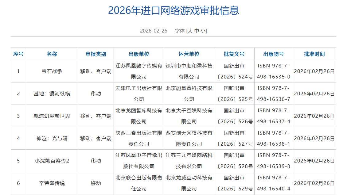 | 序号 | 名称 | 申报类别 | 出版单位 | 运营单位 | 批复文号 | 出版物号 | 批准时间 | | --- | --- | --- | --- | --- | --- | --- | --- | | 1 | 宝石战争 | 移动、客户端 | 江苏凤凰数字传媒有 深圳市中顺和盈科技 | | 国新出审 | ISBN 978-7- | 2026年02月26日 | | | | | 限公司 | 有限公司 | (2026) 524号 | 498-16535-0 | | | 2 | 基地:银河纵横 | 移动 | 天津电子出版社有限 北京能量盒科技有限 | | 国新出审 | ISBN 978-7- | 2026年02月26日 | | | | | 公司 | 公司 | [2026] 525름 | 498-16536-7 | | | 3 | 飘流幻境新世界 | 移动、客户端 | 北京龙图智库科技有 北京大千互娱科技有 | | 国新出审 | ISBN 978-7- | 2026年02月26日 | | | | | 限公司 | 限公司 | [2026] 526号 | 498-16537-4 | | | র্ব | 神泣:光与暗 ...