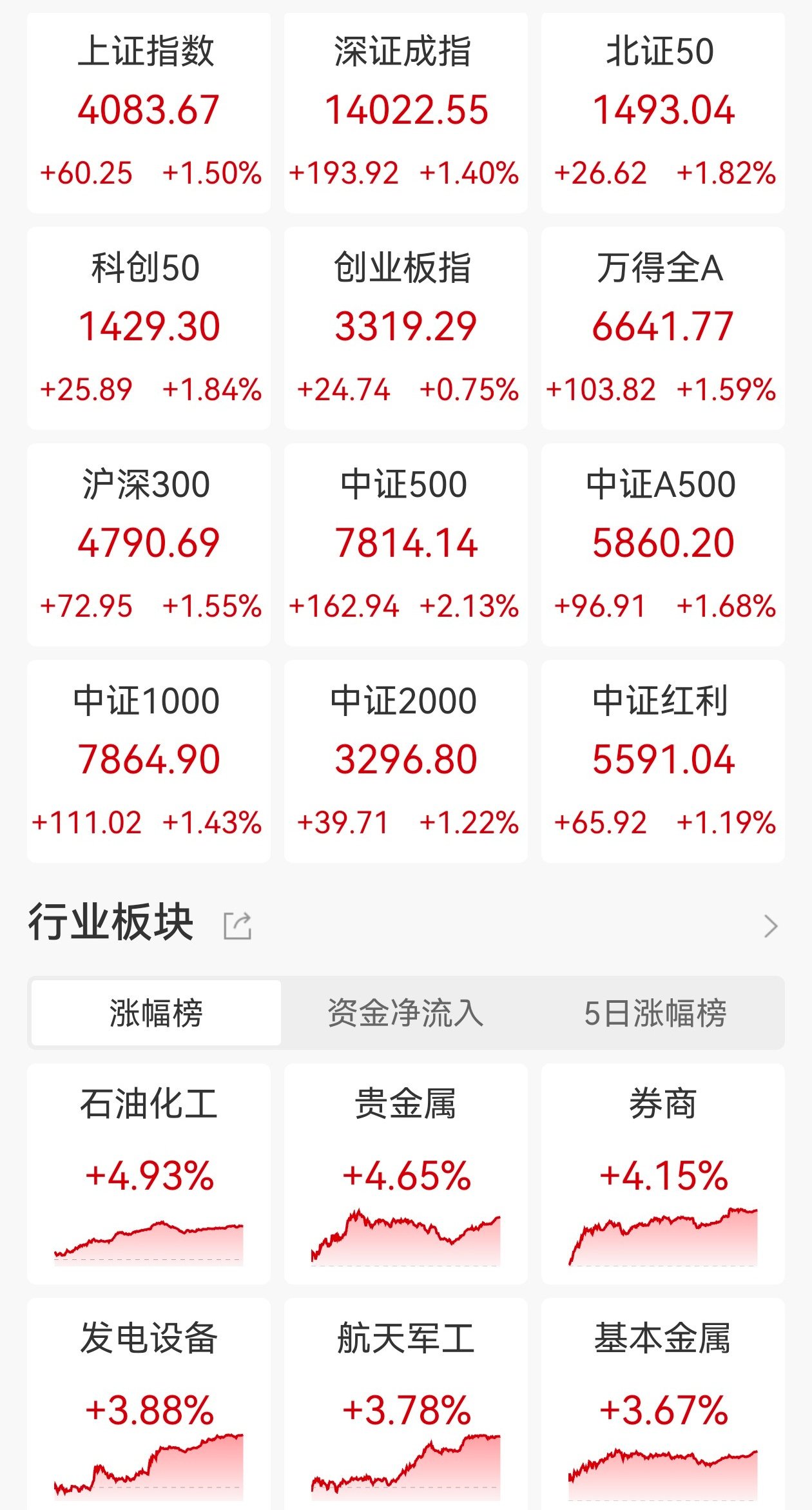 涨幅榜 资金净流入 5日涨幅* 石油化工 贵金属 券商 +4.93% +4.65% +4.159 发电设备 航天军工 基本金| +3.88% +3.78% +3.679 | 上证指数 | 深证成指 | 北证5C | | --- | --- | --- | | 4083.67 | 14022.55 | 1493.0 | | +60.25 +1.50% +193.92 +1.40% +26.62 +1 | | | | 科创20 | 创业板指 | 万得全/ | | 1429.30 | 3319.29 | 6641.7 | | +25.89 +1.84% +24.74 +0.75% +103.82 +1 | | | | 沪深300 | 中证500 | 中证A5( | | 4790.69 | 7814.14 | 5860.2 | | +72.95 +1.55% +162.94 +2.13% +96.91 +1 | | | | 中证1000 | 中证2000 | 中证红和 | | 7864.90 | 3296.80 | 5591.0 | | +111.02 +1.43% +39.71 +1.22% +65.92 +1 | ...